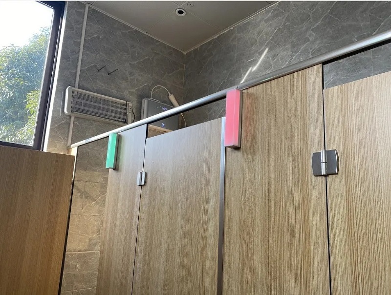 3.快速找空位:傳統公廁進入后,有時很難確定廁位是否有人,隔間門口的紅綠色標志不清晰,總要挨個拉開來判斷。有了智慧公廁,這一問題便可以完美解決。每個廁位隔間上方都安裝了一個紅外傳感設備,當使用者進入后將門反鎖,廁位門上的燈柱便會自動由綠色轉為紅色,顯示該廁位“有人”,使廁所使用情況一目了然。