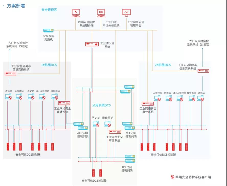 和利時(shí)典型火電控制系統(tǒng)網(wǎng)絡(luò)安全解決方案,遵照等保2.0與能源局36號(hào)文等政策法規(guī)要求,遵循“安全分區(qū)、網(wǎng)絡(luò)專用、橫向隔離、縱向保證”防御體系,針對(duì)火電廠監(jiān)控系統(tǒng)進(jìn)行安全防護(hù)設(shè)計(jì)。對(duì)火電廠監(jiān)控系統(tǒng)進(jìn)行合理的區(qū)域劃分,通過(guò)防護(hù)方案使火電廠生產(chǎn)監(jiān)控系統(tǒng)具有抵御黑客、病毒、惡意代碼等網(wǎng)絡(luò)與應(yīng)用系統(tǒng)的破壞和攻擊,阻止內(nèi)部人員的非法訪問,抵御外部攻擊,在遭受攻擊和破壞后能及時(shí)恢復(fù)系統(tǒng)的能力,確保關(guān)鍵業(yè)務(wù)數(shù)據(jù)的可用性、機(jī)密性、完整性。