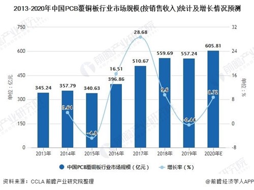 2013-2020年中國PCB覆銅板行業(yè)市場(chǎng)規(guī)模(按銷售收入)統(tǒng)計(jì)及增長情況預(yù)測(cè)