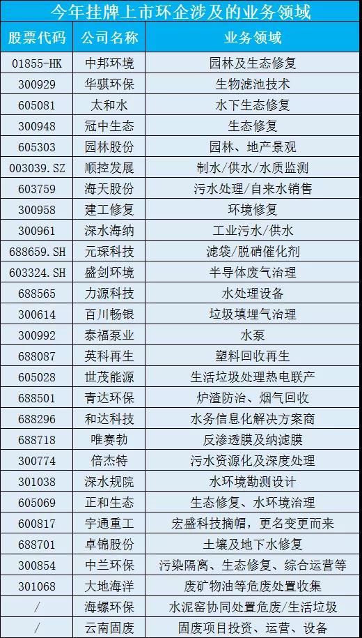 而如今上市的環保企業,無論是主板,還是創業板、科創板,都有一個共性,就是大都是給早期工程項目做配套、做服務、做運營的企業,這些企業伴隨著“前輩們”成長,他們自身也在壯大。所以我們看到近兩年上市的企業,既是環保行業非常細分的子領域,也是產業下游設備技術廠商,做膜、水泵、生物濾池、勘測設計、水質監測、垃圾滲濾液、填埋氣治理的都紛紛登錄資本市場(如下圖)。