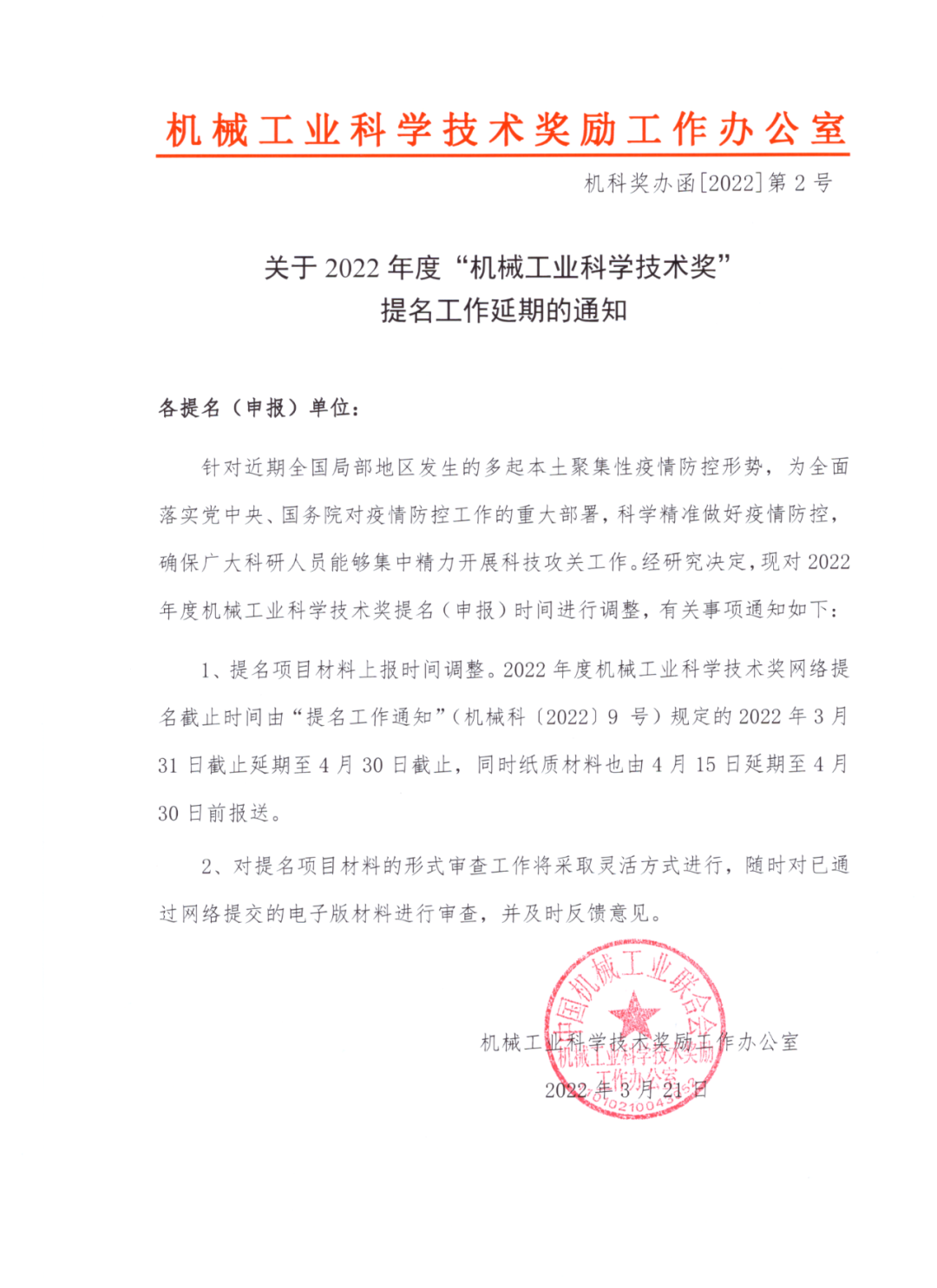 通知下載:關(guān)于2022年度“機(jī)械工業(yè)科學(xué)技術(shù)獎(jiǎng)”提名工作延期的通知
