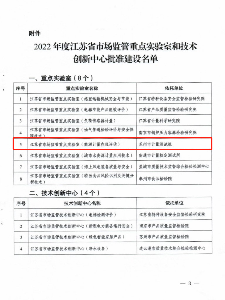 近日,江蘇省市場監督管理局發文《省市場監管局關于批準建設2022年度省市場監管重點實驗室和技術創新中心的通知》(蘇市監科信﹝2022﹞337號),蘇州計量院申報的江蘇省市場監管重點實驗室(能源計量在線評估)獲批建設
