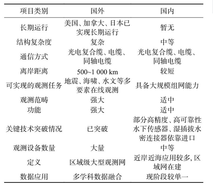 目前,美國、加拿大、日本等西方國家均已建成并運行有區域級海底觀測網,組網了大量的多源傳感器,并在離岸千米級公里開展了業務應用。國內海底觀測系統研發起步雖然較晚,但經過十余年的發展,已逐漸由單一海底觀測系統發展至系統組網,在一定程度上已經具備了組網海底觀測系統的能力,并啟動了區域級海底觀測網的建設工作。但在技術發展過程中,也存在一定的差距,如亟需突破高精度、高穩定性的海洋傳感器和水下濕插拔連接器等關鍵核心技術,國內外主要技術進展比較見表1。
