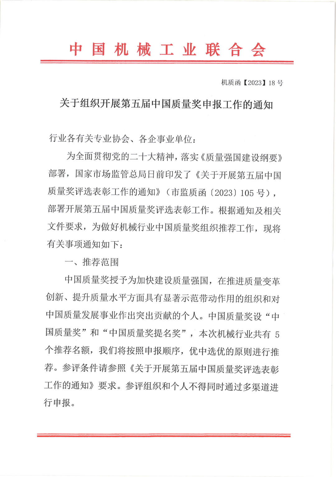 為全面貫徹黨的二十大精神,落實《質量強國建設綱要》部署,國家市場監管總局日前印發了《關于開展第五屆中國質量獎評選表彰工作的通知》(市監質函〔2023〕105號),部署開展第五屆中國質量獎評選表彰工作。根據通知及相關文件要求,為做好機械行業中國質量獎組織推薦工作,現將有關事項通知如下: