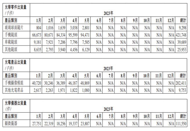 近日,舜宇光學科技公布2023年5月各主要產品出貨量。