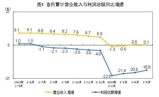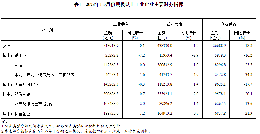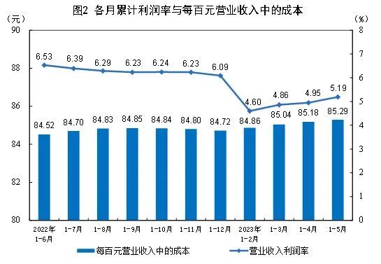 1—5月份,規(guī)模以上工業(yè)企業(yè)實(shí)現(xiàn)營業(yè)收入51.39萬億元,同比增長0.1%;發(fā)生營業(yè)成本43.83萬億元,增長1.2%;營業(yè)收入利潤率為5.19%,同比下降1.21個(gè)百分點(diǎn)。