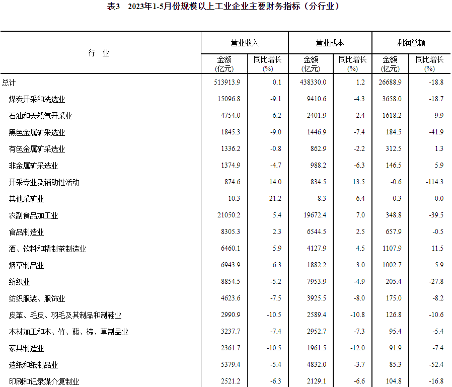 1—5月份,在41個(gè)工業(yè)大類行業(yè)中,14個(gè)行業(yè)利潤總額同比增長,1個(gè)行業(yè)持平,24個(gè)行業(yè)下降,2個(gè)行業(yè)由盈轉(zhuǎn)虧。主要行業(yè)利潤情況如下:電力、熱力生產(chǎn)和供應(yīng)業(yè)利潤總額同比增長45.9%,電氣機(jī)械和器材制造業(yè)增長29.2%,汽車制造業(yè)增長24.3%,通用設(shè)備制造業(yè)增長23.4%,專用設(shè)備制造業(yè)下降0.1%,石油和天然氣開采業(yè)下降9.9%,煤炭開采和洗選業(yè)下降18.7%,非金屬礦物制品業(yè)下降25.9%,紡織業(yè)下降27.8%,農(nóng)副食品加工業(yè)下降39.5%,計(jì)算機(jī)、通信和其他電子設(shè)備制造業(yè)下降49.2%,化學(xué)原料和化學(xué)制品制造業(yè)下降52.4%,有色金屬冶煉和壓延加工業(yè)下降53.0%,石油、煤炭及其他燃料加工業(yè)下降92.8%,黑色金屬冶煉和壓延加工業(yè)由盈利轉(zhuǎn)為虧損。