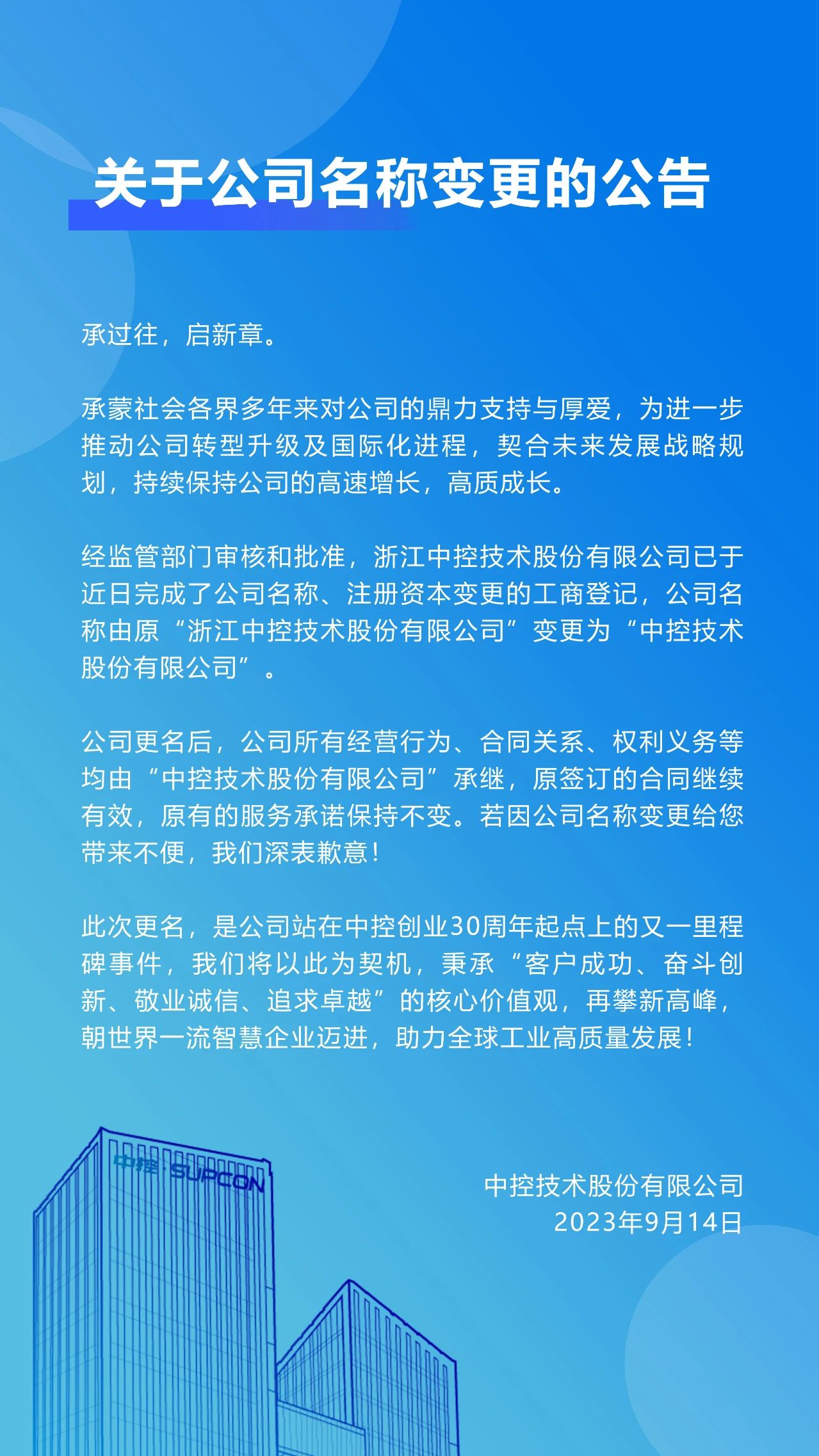 正式更名!中控技術股份有限公司