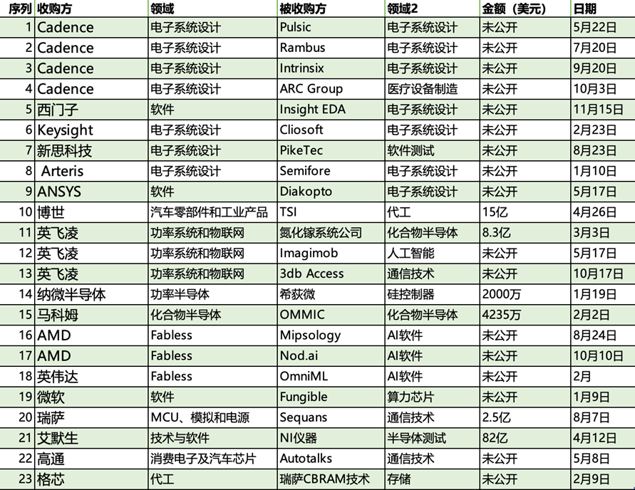 2023年,半導體市場的逆風周期仍未過去,企業收并購的腳步卻不曾停歇。根據公開的信息,記者梳理了23樁半導體領域的國際收并購案例,發現2023年全球半導體領域的收并購案主要集中在AI、EDA、寬禁帶半導體等領域,呈現以下特點。