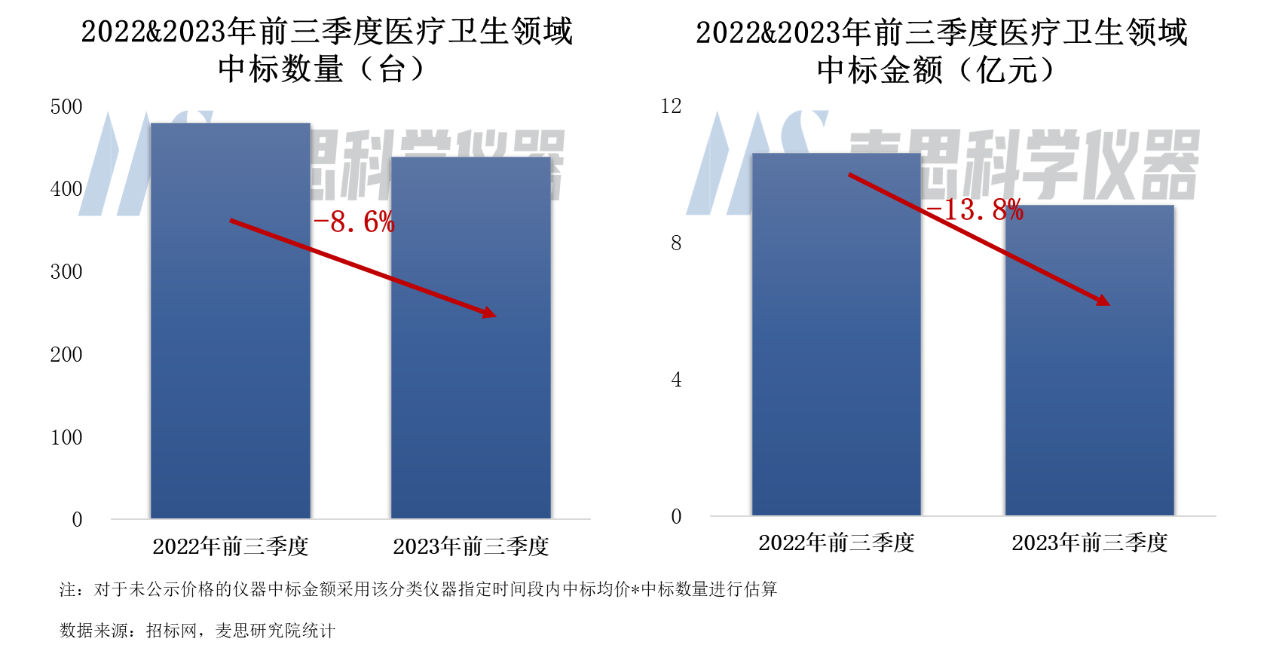 2023年前三季度質(zhì)譜儀器在醫(yī)療衛(wèi)生領(lǐng)域的中標(biāo)數(shù)量達(dá)到438臺,同比下降8.6%。中標(biāo)市場規(guī)模約9.1億,同比下降13.8%。