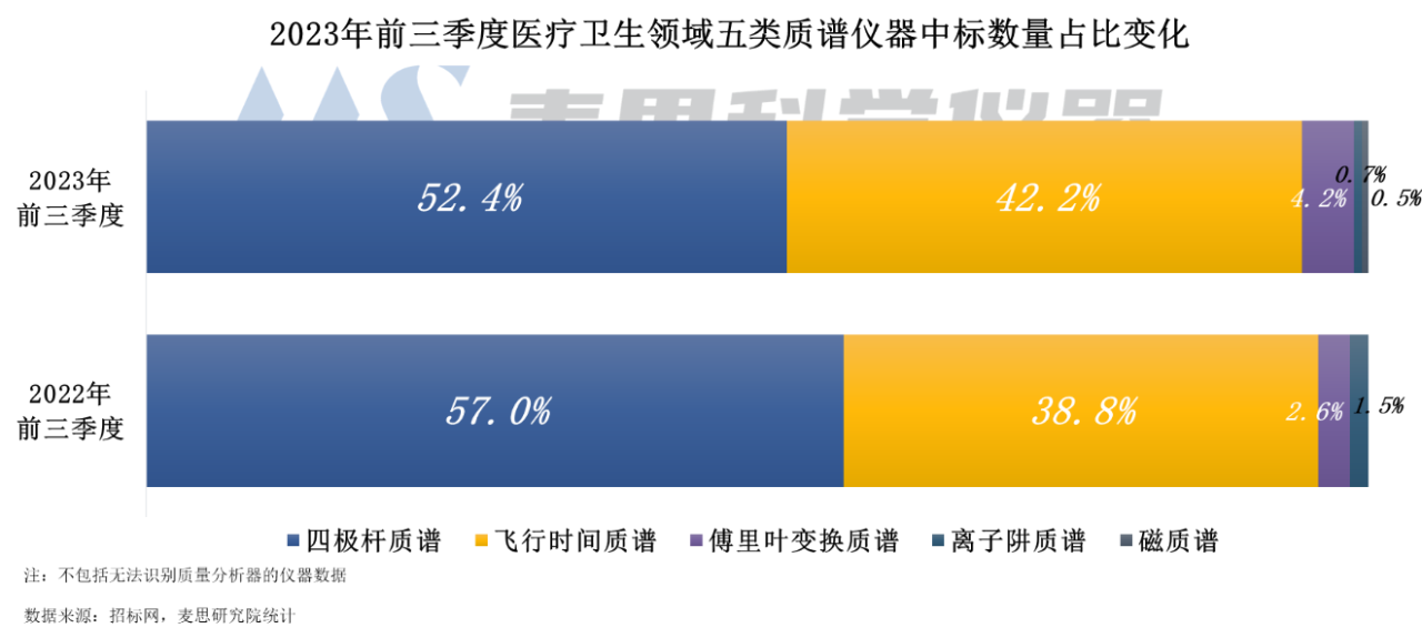 從各技術(shù)路線看,2023年前三季度醫(yī)療衛(wèi)生領(lǐng)域中標(biāo)質(zhì)譜主要為四極桿質(zhì)譜和飛行時間質(zhì)譜,合計占比高達(dá)95%。其中四極桿質(zhì)譜中標(biāo)數(shù)量最多,占比52.4%,但同比減少4.6個百分點;其次是飛行時間質(zhì)譜,占比42.2%,同比增加3.4個百分點;傅里葉變換質(zhì)譜占比4.2%,同比增加1.6個百分點。離子阱質(zhì)譜、磁質(zhì)譜中標(biāo)數(shù)量極少。