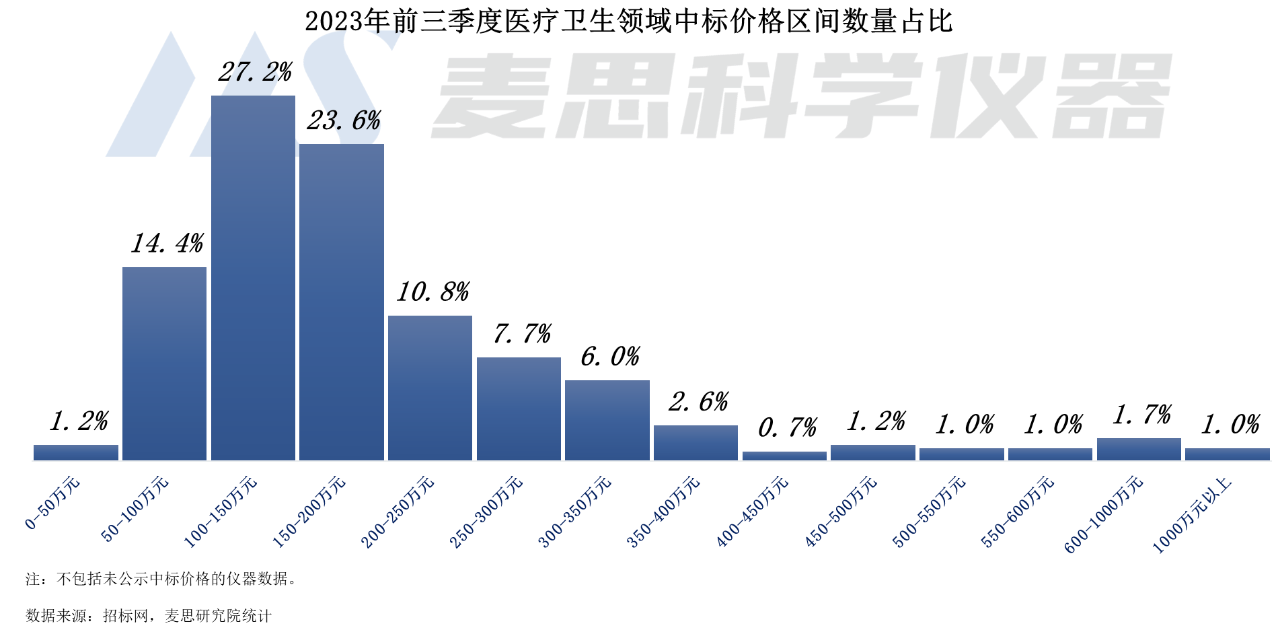 從各價格區(qū)間的中標(biāo)數(shù)量占比來看,醫(yī)療衛(wèi)生領(lǐng)域質(zhì)譜儀器中標(biāo)單價基本在50-350萬元之間,占比約90%。其中,單價在100-150萬元以內(nèi)的質(zhì)譜儀器數(shù)量最多,2023年前三季度中標(biāo)數(shù)量占比約27.2%。