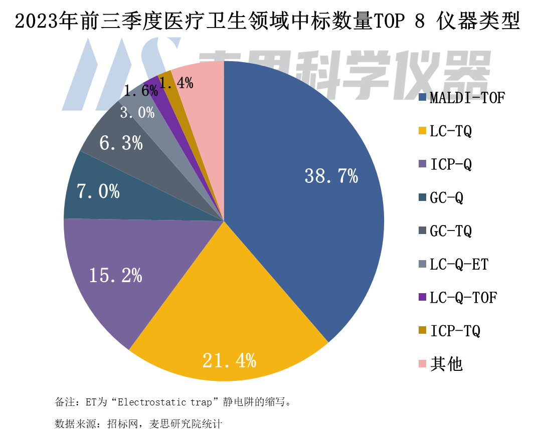 2023年前三季度中標(biāo)數(shù)量Top 8儀器類型分別為MALDI-TOF、LC-TQ、ICP-Q、GC-Q、GC-TQ、LC-Q-ET、LC-Q-TOF和ICP-TQ,中標(biāo)數(shù)量合計占比約95%。其中MALDI-TOF和LC-TQ是主流產(chǎn)品,占比超60%。