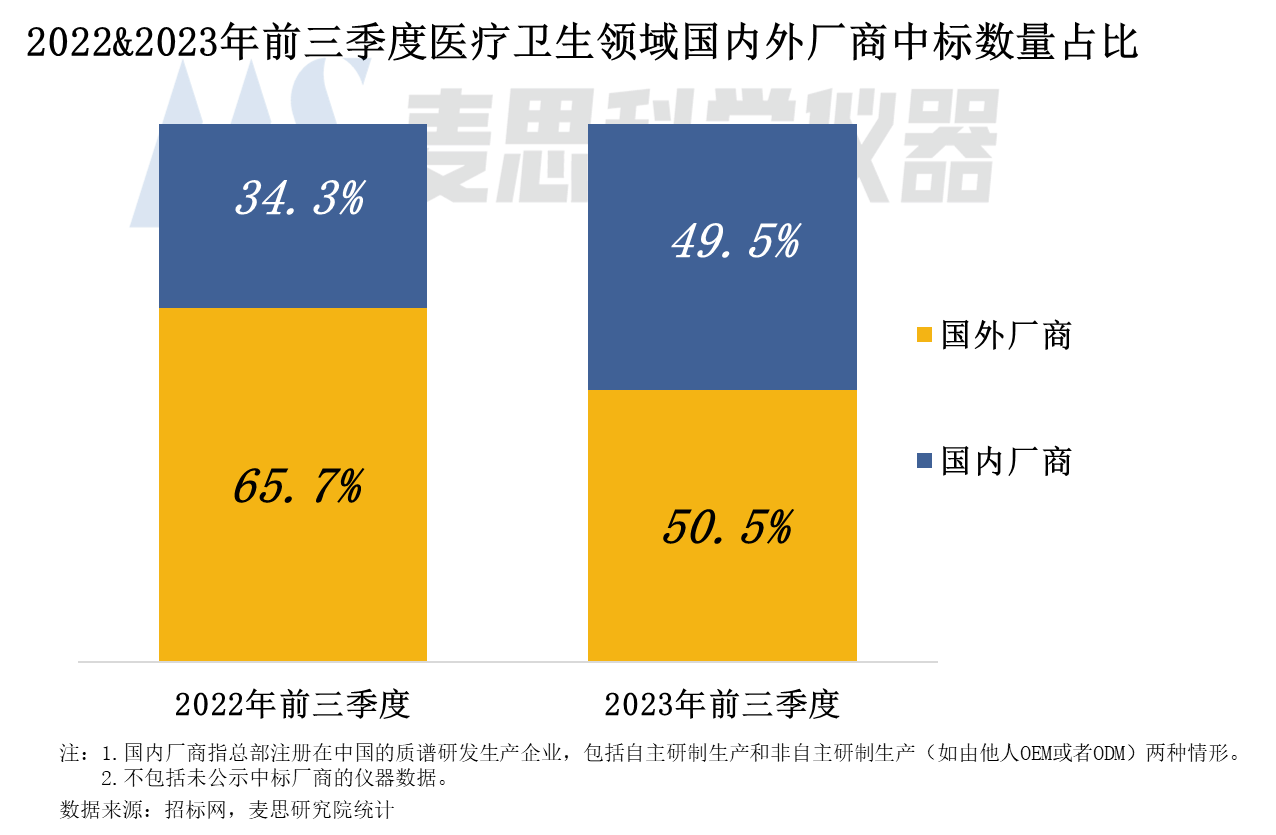 質(zhì)譜儀器中標(biāo)數(shù)量國產(chǎn)化率較高,與國外廠商中標(biāo)數(shù)量占比僅有1個百分點的差距。與2022年同期對比,2023年前三季度國內(nèi)廠商在醫(yī)療衛(wèi)生領(lǐng)域的中標(biāo)數(shù)量占比增長顯著,從34.3%增加至49.5%,增幅15個百分點。