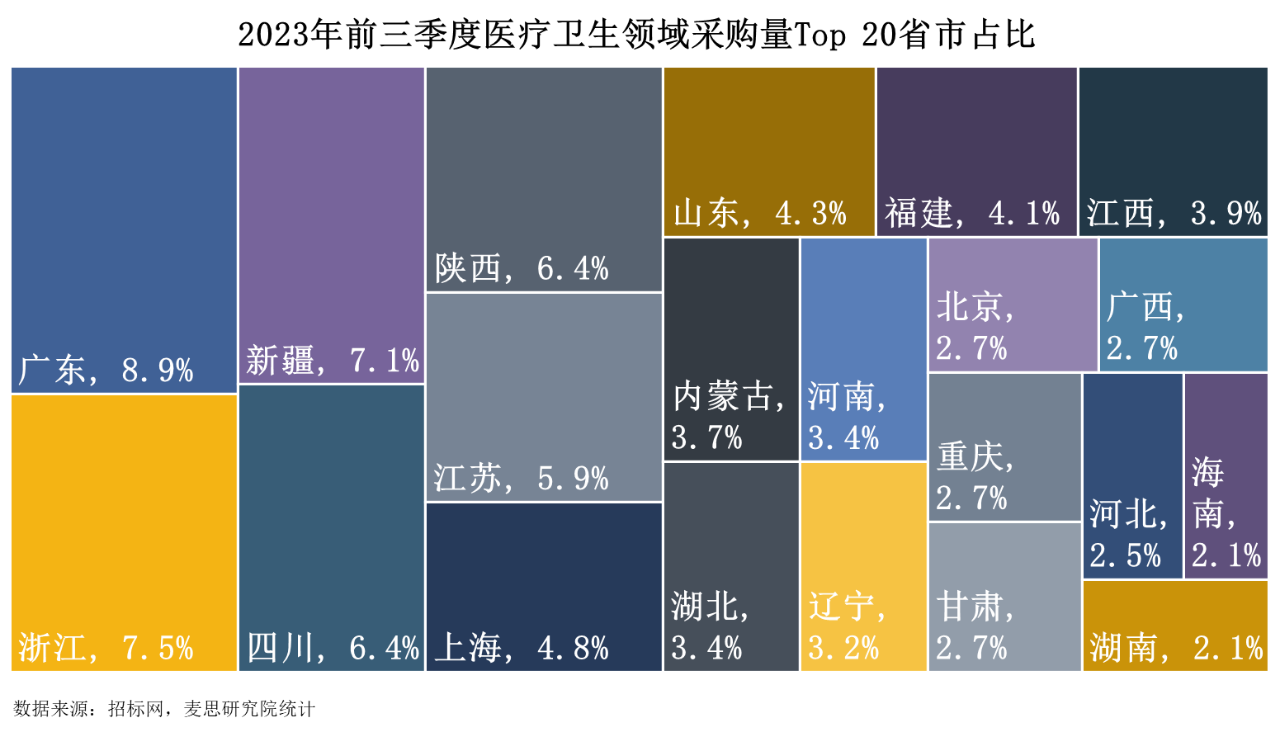 2023年前三季度,廣東、浙江、新疆、四川、陜西為醫(yī)療衛(wèi)生域質(zhì)譜儀器采購量的Top 5省份,中標(biāo)數(shù)量占比合計36.3%。