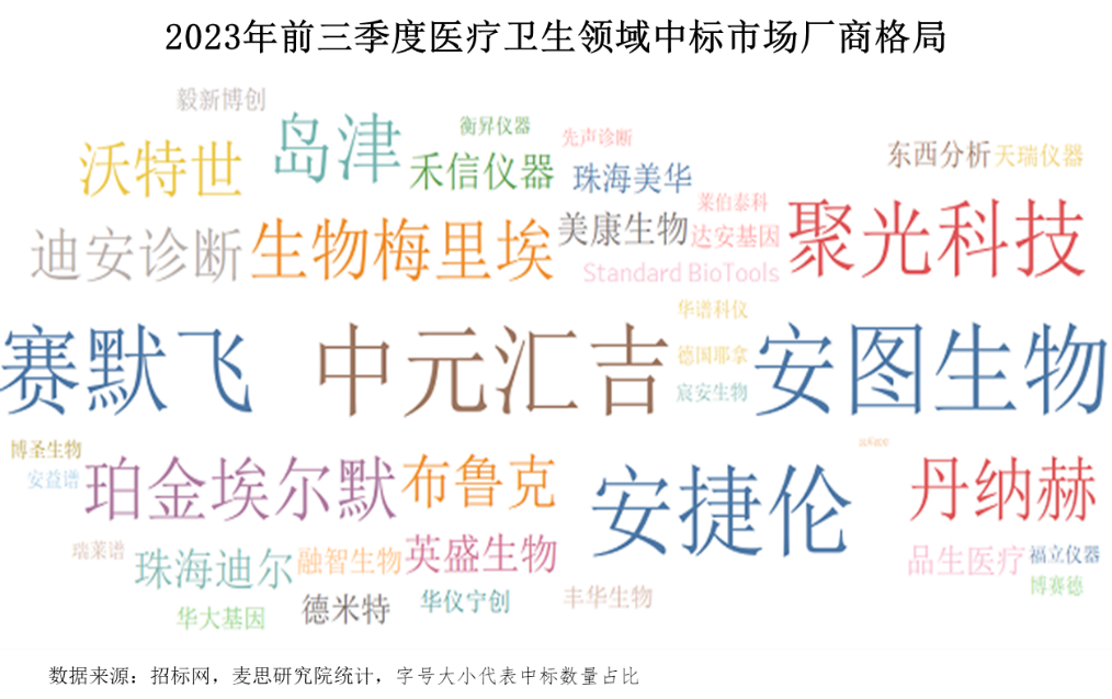 醫(yī)療衛(wèi)生領(lǐng)域中標(biāo)數(shù)量Top 5企業(yè)分別為中元匯吉、安圖生物、安捷倫、賽默飛、聚光科技。相較于其他領(lǐng)域,國內(nèi)廠商在醫(yī)療衛(wèi)生領(lǐng)域表現(xiàn)優(yōu)異。