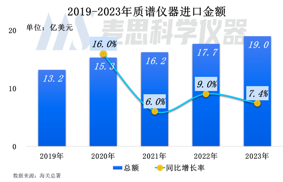 2023年我國質(zhì)譜儀器(含質(zhì)譜聯(lián)用儀和其他質(zhì)譜儀)進口金額達19.0億美元(約合人民幣133億元),同比上升7.4%。進口質(zhì)譜需求依然旺盛。