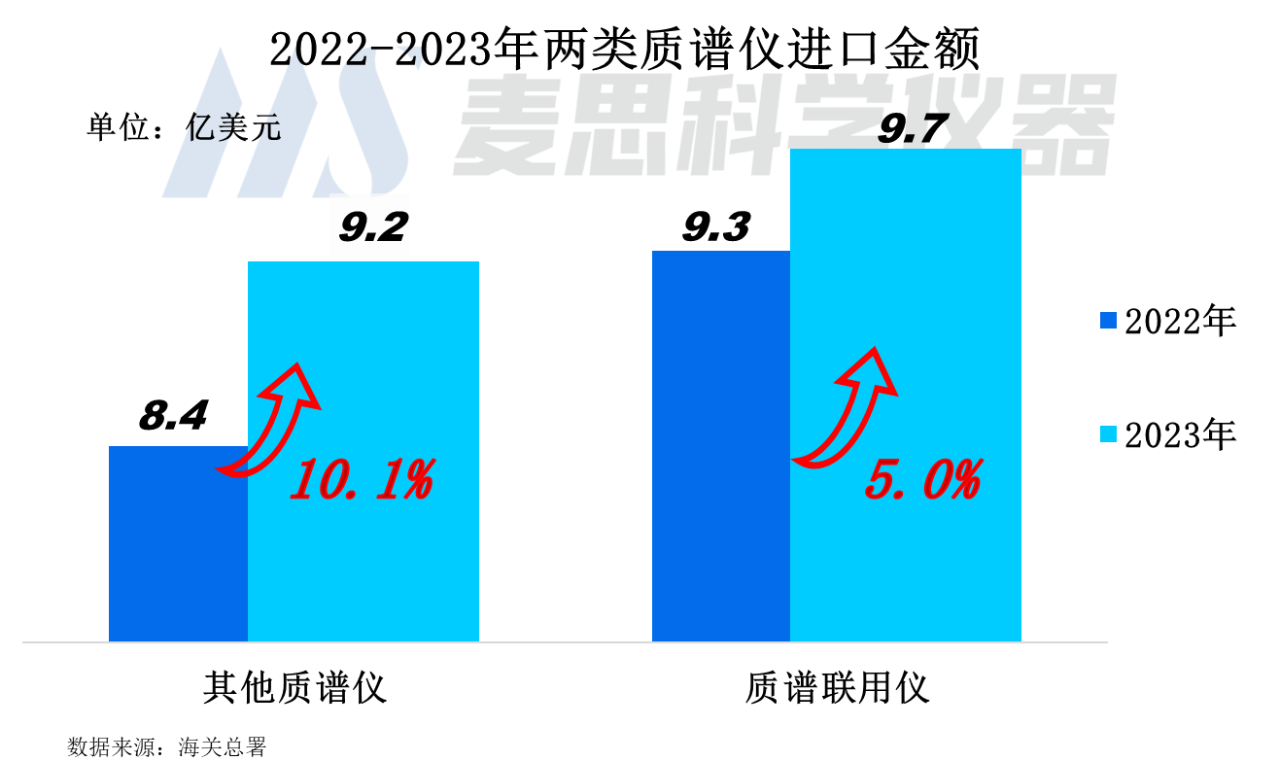 2023年其他質(zhì)譜儀的進口金額為9.2億美元,較2022年同比增長了10.1%。質(zhì)譜聯(lián)用儀進口金額達9.7億美元,較2022年增長5.0%。兩類質(zhì)譜儀進口規(guī)模均呈現(xiàn)正增長。