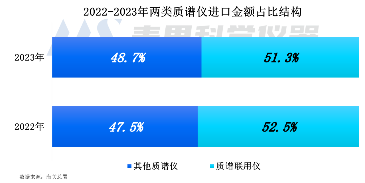 2023年質(zhì)譜聯(lián)用儀的進口金額占比達51.3%,與上年相比減少1.2個百分點;其他質(zhì)譜儀的占比為48.7%。從兩類質(zhì)譜儀的金額占比結(jié)構(gòu)看,質(zhì)譜聯(lián)用儀的進口需求更旺盛,但兩類質(zhì)譜儀的份額差距在縮小。
