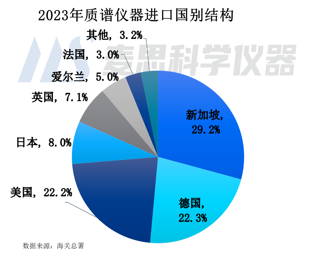從2023年質(zhì)譜儀器進口國別結(jié)構(gòu)看,排名前五位為新加坡、德國、美國、日本以及英國,進口金額占比分別為29.2%、22.3%、22.2%、8.0%以及7.1%。