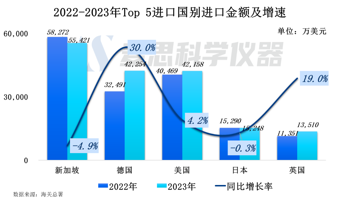 對比Top5國別2022年及2023年進口金額,從德國、美國、英國進口的質(zhì)譜儀器金額呈現(xiàn)正增長,其中德國最為明顯,同比增速達30.0%。而新加坡和日本的進口金額則有輕微下降趨勢,同比下滑4.9%和0.3%。