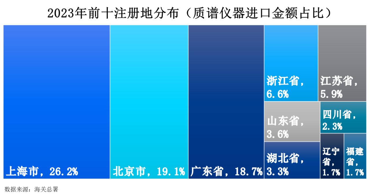 2023年質(zhì)譜儀器進口額前十注冊地分別為上海市、北京市、廣東省、浙江省、江蘇省、山東省、湖北省、四川省、遼寧省以及福建省,占比分別為26.2%、19.1%、18.7%、6.6%、5.9%、3.6%、3.3%、2.3%、1.7%以及1.7%。