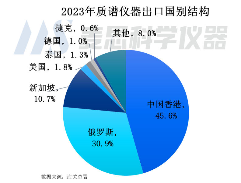 從2023年質(zhì)譜儀器出口國別結(jié)構(gòu)看,排名前五位為中國香港(轉(zhuǎn)口貿(mào)易)、俄羅斯、新加坡、美國以及泰國,出口金額占比分別為45.6%、30.9%、10.7%、1.8%以及1.3%。