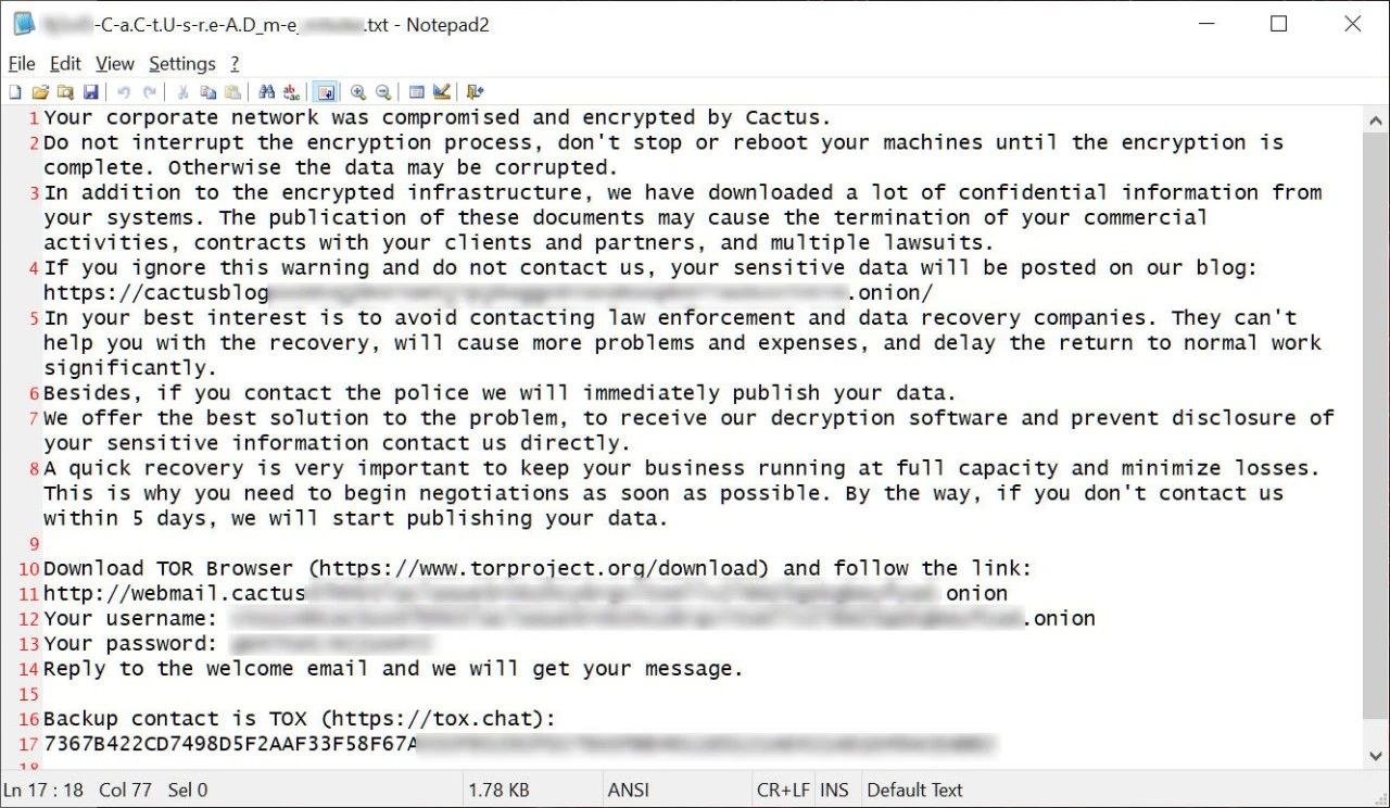Cactus 勒索軟件行動于 2023 年 3 月啟動,與所有勒索軟件行動一樣,威脅攻擊者會通過購買憑證、與惡意軟件分銷商合作、網絡釣魚攻擊或利用漏洞入侵企業(yè)網絡。一旦進入網絡,就會悄悄擴散到其他系統(tǒng),同時竊取服務器上的企業(yè)數據。在竊取數據并獲得網絡管理權限后,威脅攻擊者會加密文件并留下贖金說明。