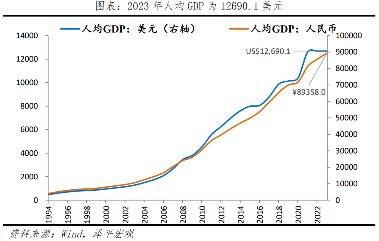 我國已接近高收入國家標(biāo)準(zhǔn),但距離2萬美元的發(fā)達(dá)國家門檻仍有一段距離。2023年人均GDP為89358.0元,名義增長5.4%,較上年增速擴(kuò)大2.4個(gè)百分點(diǎn);全員勞動(dòng)生產(chǎn)率為161615元/人,比上年提高5.7%。按世界銀行標(biāo)準(zhǔn),高收入國家人均GNI門檻約為13845美元。以美元計(jì)價(jià),我國2023年人均GDP為12690.1美元,人均GNI為12596.6美元,接近高收入國家門檻。