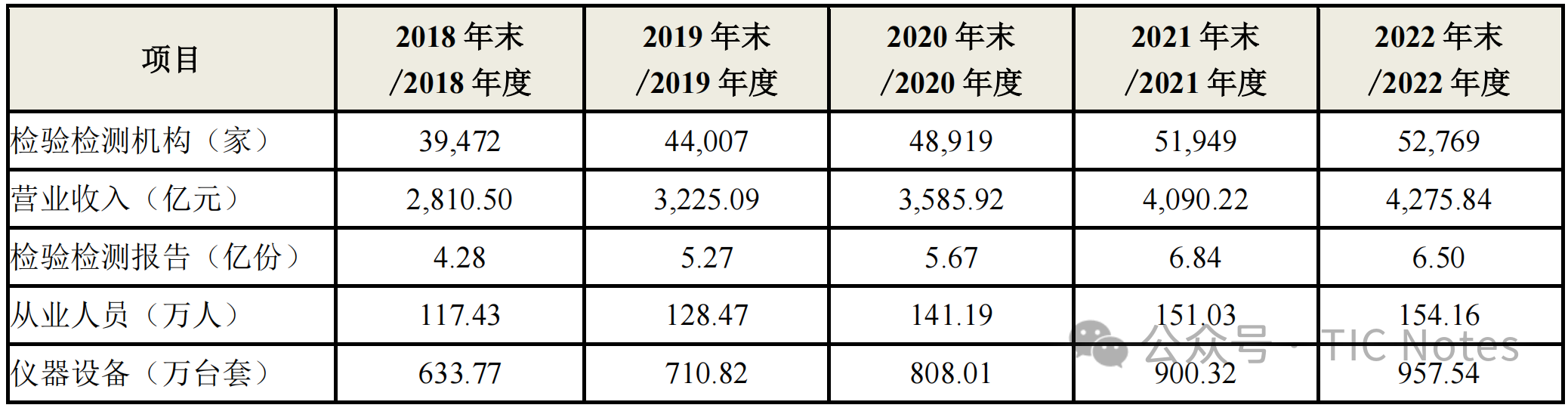 我國檢驗(yàn)檢測服務(wù)業(yè)現(xiàn)已覆蓋建筑工程、環(huán)保、衛(wèi)生、農(nóng)業(yè)、質(zhì)檢、食品、藥品、機(jī)械、電子、輕工、紡織、航空等國民經(jīng)濟(jì)各個(gè)領(lǐng)域,根據(jù)國家市場監(jiān)督管理總局于 2023 年 6 月發(fā)布的《2022 年度全國檢驗(yàn)檢測服務(wù)業(yè)統(tǒng)計(jì)簡報(bào)》(以下簡稱“統(tǒng)計(jì)簡報(bào)”),我國檢驗(yàn)檢測行業(yè)規(guī)模繼續(xù)擴(kuò)大;2022 年末,獲得資質(zhì)認(rèn)定的各類檢驗(yàn)檢測機(jī)構(gòu) 52,769 家,較 2021 年末增長 1.58%;2022 年度實(shí)現(xiàn)營業(yè)收入 4,275.84 億元,較 2021 年度增長 4.54%;2022 年度共向社會(huì)出具檢驗(yàn)檢測報(bào)告 6.50 億份,較 2021 年度下降 4.97% 。