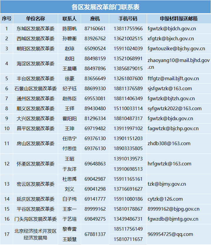 請于520日前向區發展改革部門申報(可為項目所在地或項目單位注冊地所在區發展改革部門)。此次項目征集還梳理了各區發展改革部門聯絡員的聯系方式、申報郵箱,歡迎有需要的企業就近就便咨詢政策。