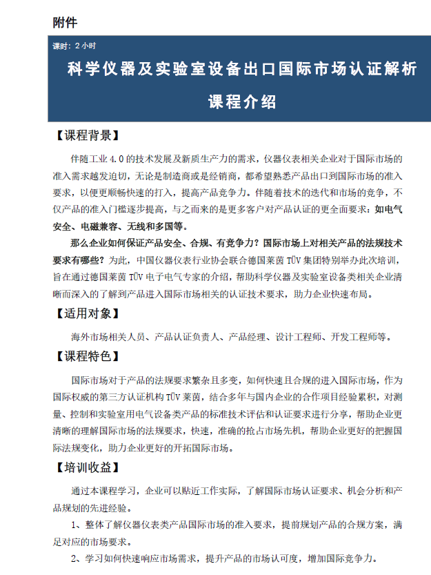 附件:科學(xué)儀器及實(shí)驗(yàn)室設(shè)備出口國(guó)際市場(chǎng)認(rèn)證解析課程介紹