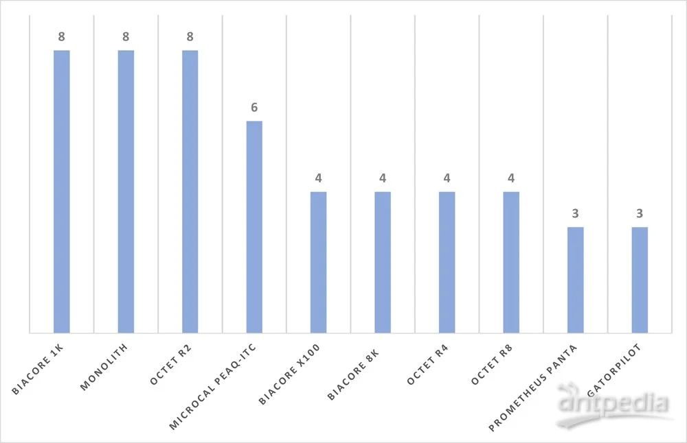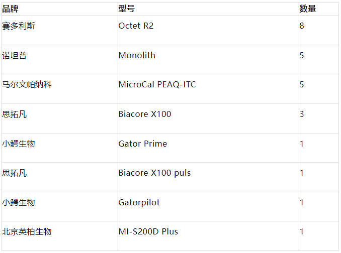 在所有中標產(chǎn)品中,中標型號前三名分別是思拓凡的Biacore 1K、諾坦普的Monolith、賽多利斯的Octet R2,中標數(shù)量排名第四的是馬爾文帕納科的MicroCal PEAQ-ITC,其次思拓凡的Biacore 8K和Biacore X100、賽多利斯的Octet R8和Octet R4、諾坦普的Prometheus Panta、小鱷生物的GatorPilot分別占據(jù)第5-10名的席位。總的來看思拓凡和賽多利斯的中標型號最多,各有三個,表現(xiàn)出較高的市場認可度,諾坦普占據(jù)兩席,穩(wěn)穩(wěn)站住榜單前三的位置。
