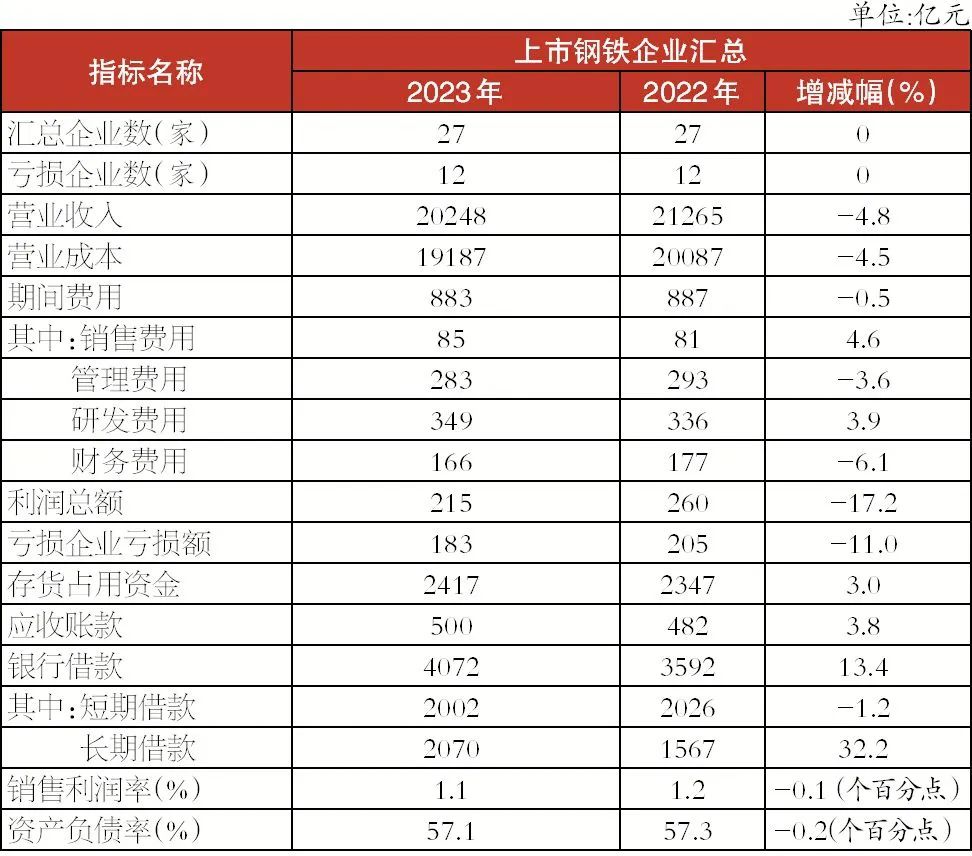 進(jìn)入2024年第1季度,鋼鐵行業(yè)運(yùn)行情況仍不樂(lè)觀,經(jīng)濟(jì)效益繼續(xù)下滑。27家上市鋼企合計(jì)營(yíng)業(yè)收入4715億元,同比下降5.9%;合計(jì)營(yíng)業(yè)成本4533億元,同比下降4.9%;合計(jì)期間費(fèi)用201億元,同比下降1.7%;合計(jì)實(shí)現(xiàn)利潤(rùn)虧損1億元,同比由盈變虧;虧損額69億元,同比增長(zhǎng)118.1%;虧損面48.2%;平均銷(xiāo)售利潤(rùn)率-0.02%,同比下降1.02個(gè)百分點(diǎn)。截至第1季度末,存貨占用資金同比下降4.3%;應(yīng)收賬款同比增長(zhǎng)8.4%;短期借款同比下降0.3%;長(zhǎng)期借款同比增長(zhǎng)8.9%;平均資產(chǎn)負(fù)債率57.3%,同比下降0.7個(gè)百分點(diǎn)。具體各指標(biāo)情況見(jiàn)下表:
