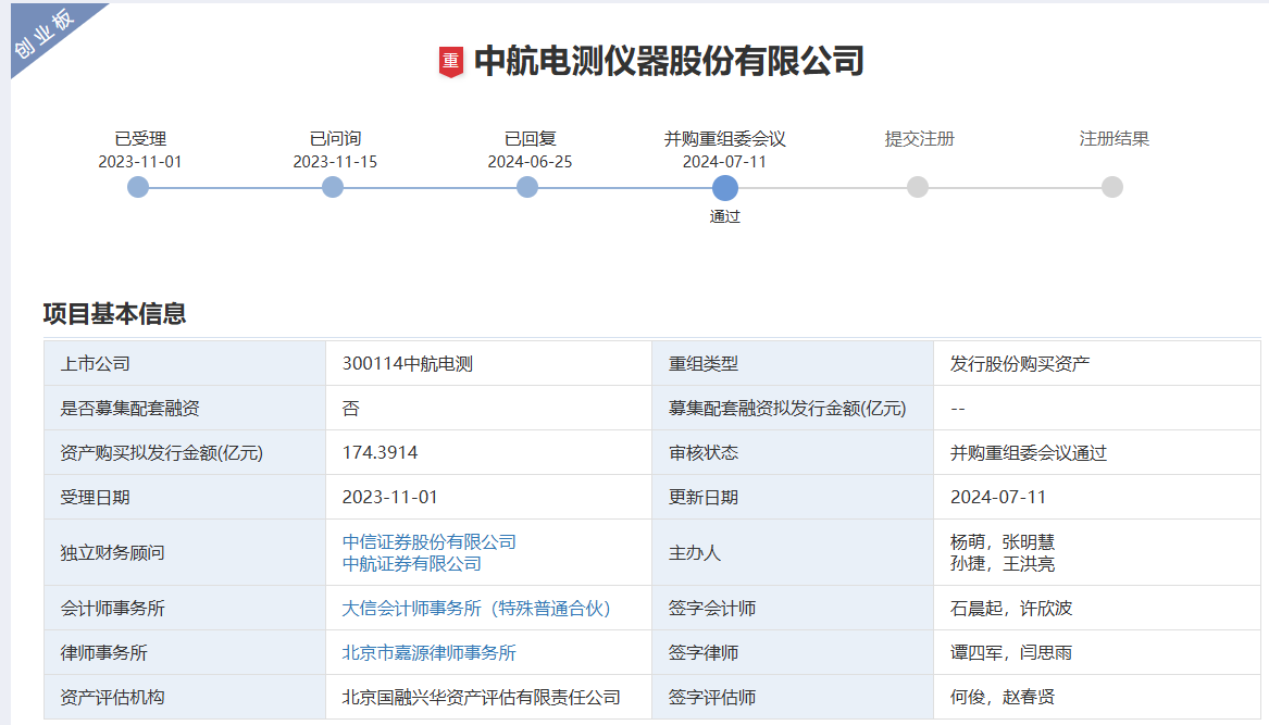 7月11日,深交所并購重組委舉行2024年第2次審議會議,中航電測儀器股份有限公司發(fā)行股份購買資產(chǎn)申請獲通過。