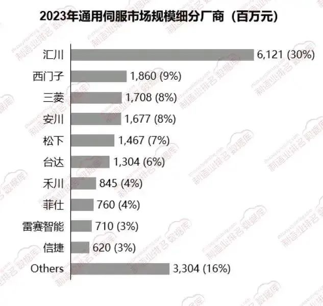 2023年的銷售額數據來看,通用伺服市場呈現出較高的集中度,前五家廠商的市場份額超過60%。其中,匯川以30%的市場份額位居第一,領先于西門子、三菱等國際品牌。