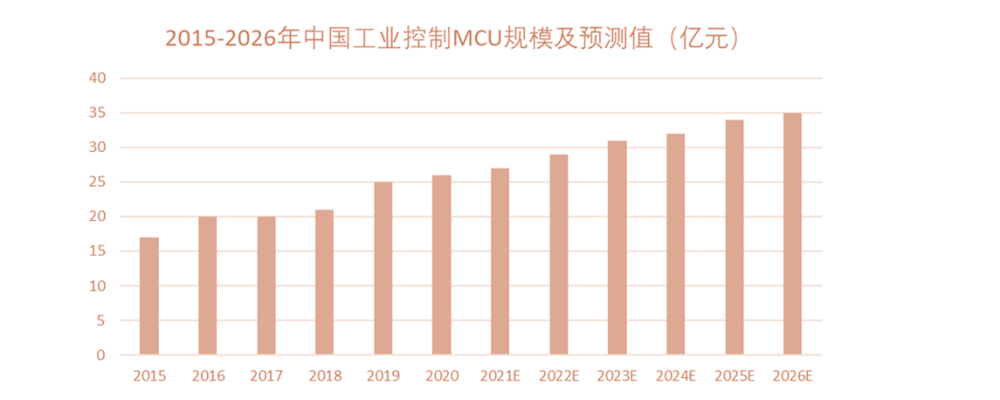 全球工業自動化與控制市場的廣闊前景,勢必強勁推動MCU需求增長。據統計,2020年工控對MCU需求規模達到26億元,預計至2026年,市場規模將達到35億元。