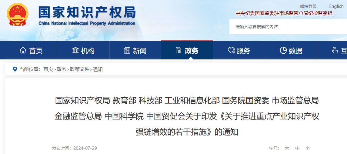 為貫徹落實黨中央、國務院決策部署,有力推動重點產業知識產權強鏈增效工作,國家知識產權局聯合教育部、科技部、工業和信息化部、國務院國資委、市場監督管理總局、國家金融監督管理總局、中國科學院、中國國際貿易促進委員會等部門,在充分調研、廣泛征求意見的基礎上,研究制定了《若干措施》,于2024621日正式印發。