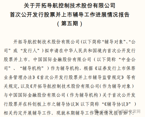 2023 年 4 月 28 日,開拓導(dǎo)航與中國國際金融股份有限公司簽署IPO輔導(dǎo)協(xié)議,截止2024年7月19日,已完成第五期輔導(dǎo)工作。