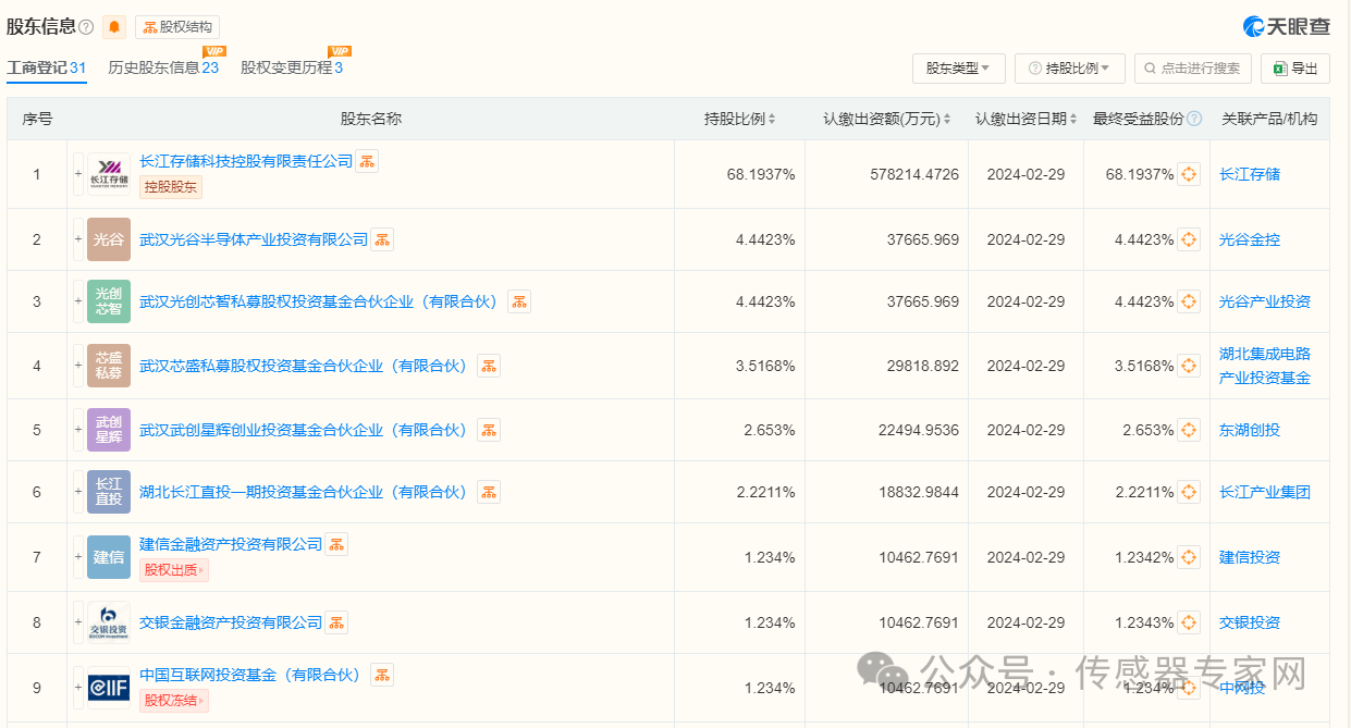 2024年2月29日,武漢新芯引入30多家投資機(jī)構(gòu),包括廈門炬達(dá)二號(hào)投資合伙企業(yè)(有限合伙),武漢金融控股,武漢光谷半導(dǎo)體產(chǎn)業(yè)投資有限公司,武漢光創(chuàng)芯智私募股權(quán)投資基金,國鑫創(chuàng)投,招銀國際,長投集團(tuán),謝諾投資,中信證券,中國農(nóng)業(yè)銀行,中銀金融,湖北高投,恒盛融通投資,建信投資,中國工商銀行,東湖創(chuàng)投,交銀金融資產(chǎn)投資有限公司,海通創(chuàng)意資本,湖北長江直投等等。目前,武漢新芯的控股股東為長江存儲(chǔ), 持股超68%。