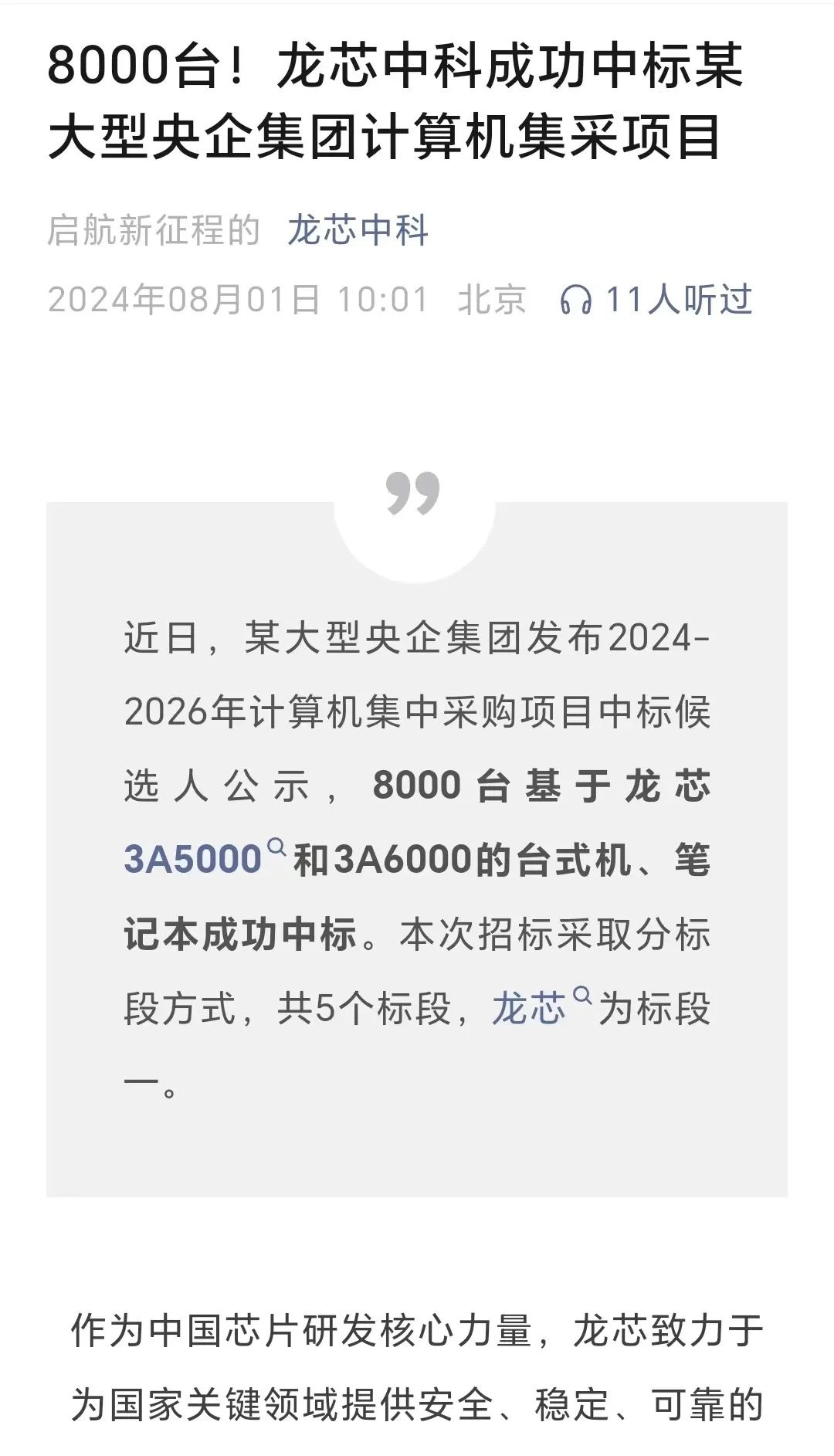 8月1日,龍芯中科在其官方微信公號中曾發(fā)文稱,近日,某大型央企集團(tuán)發(fā)布2024年-2026年計(jì)算機(jī)集中采購項(xiàng)目中標(biāo)候選人公示,8000臺基于龍芯3A5000和3A6000的臺式機(jī)、筆記本成功中標(biāo)。本次招標(biāo)采取分標(biāo)段方式,共5個標(biāo)段,龍芯為標(biāo)段一。