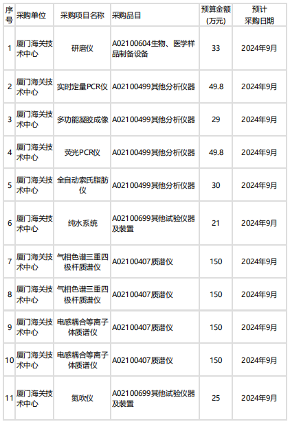 廈門海關技術中心本次共計預算2748萬,預采購實時定量PCR儀、多功能凝膠成像系統、氣相色譜三重四級桿質譜儀、電感耦合等離子體質譜儀等。