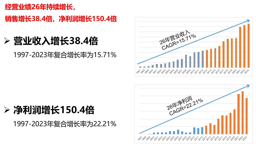成立26年來,公司銷售增長38.4倍,凈利潤增長150.4倍,凈利潤年復(fù)合增長達(dá)22.21%。