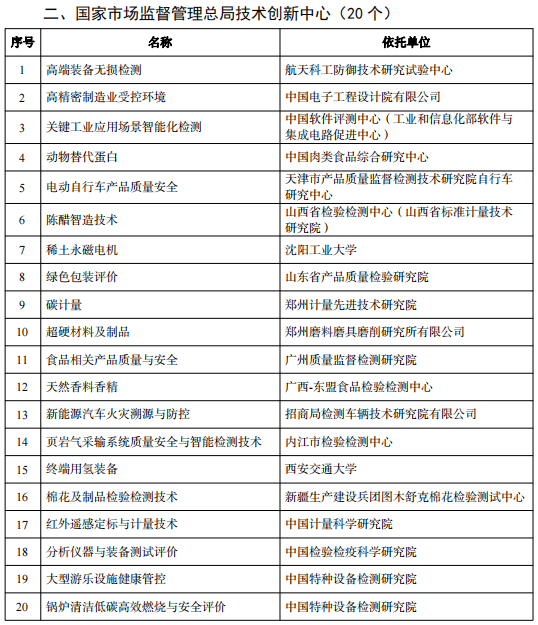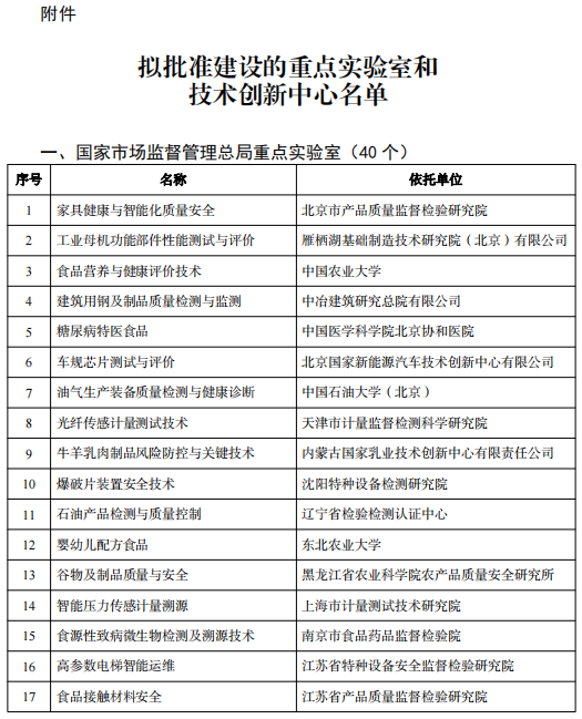 依據(jù)《國家市場監(jiān)管重點(diǎn)實(shí)驗(yàn)室管理暫行辦法》《國家市場監(jiān)管技術(shù)創(chuàng)新中心管理暫行辦法》要求,市場監(jiān)管總局科技和財(cái)務(wù)司組織完成了2023年度總局重點(diǎn)實(shí)驗(yàn)室和技術(shù)創(chuàng)新中心申報(bào)項(xiàng)目的評(píng)審工作。經(jīng)組織申報(bào)、形式審查、集中評(píng)審、現(xiàn)場核查和綜合論證等程序,擬批準(zhǔn)建設(shè)重點(diǎn)實(shí)驗(yàn)室40個(gè)、技術(shù)創(chuàng)新中心20個(gè),現(xiàn)予以公示。