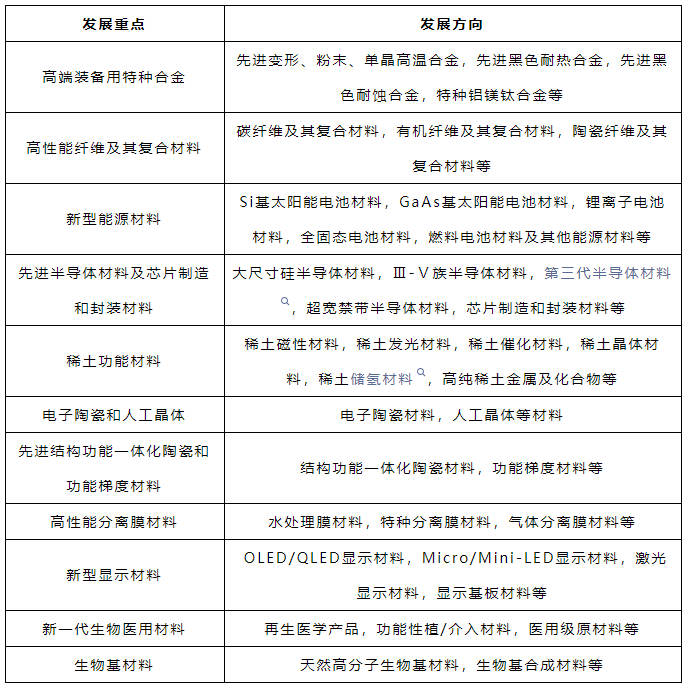 關鍵戰略材料領域發展重點及發展方向主要包括高端裝備用特種合金、高性能纖維及其復合材料、新型能源材料、先進半導體材料及芯片制造和封裝 材料、稀土功能材料、電子陶瓷和人工晶體、先進結構功能一體化陶瓷和功能梯度材料、高性能分離膜材料、新型顯示材料、新一代生物醫用材料及生物基材料等(見表6)。