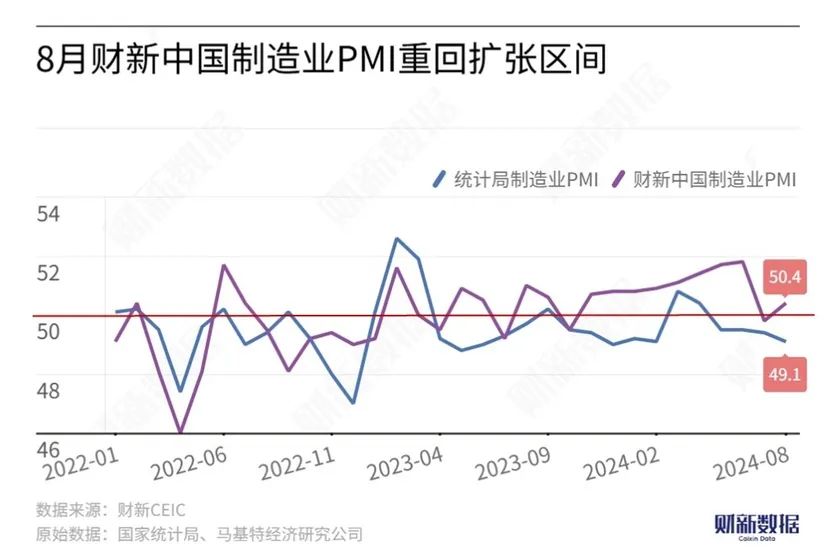 9月2日公布的8月財新中國制造業(yè)采購經(jīng)理指數(shù)(PMI)錄得50.4,較7月回升0.6個百分點,重回榮枯線以上。