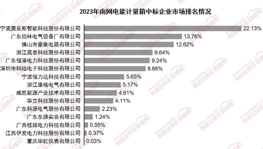 2023年度,南網(wǎng)范圍內(nèi)電能計量箱產(chǎn)品的招標(biāo)市場總體規(guī)模約為5.4億元,共有15家企業(yè)中標(biāo)。在這些企業(yè)中,寧波奧克斯智能科技股份有限公司中標(biāo)金額最大,約為1.2億元元,占比約22.1%。其次,是廣東佰林電氣設(shè)備廠有限公司和佛山市豪象電器有限公司,中標(biāo)金額分別為74.6百萬元和68.4百萬元,占比分別為13.8%和12.6%。整體來看,南網(wǎng)電能計量箱產(chǎn)品市場的供應(yīng)商整體較為集中。