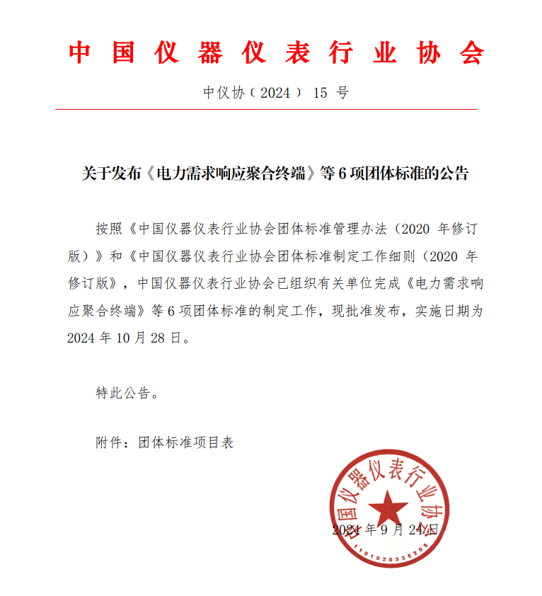 近日,根據(jù)《中國儀器儀表行業(yè)協(xié)會團體標準管理辦法》的規(guī)定,中國儀器儀表行業(yè)協(xié)會(簡稱“協(xié)會”)組織完成了由協(xié)會電工儀器儀表分會提出的《電力需求響應聚合終端》等4項、試驗儀器分會提出的《溫差電器件致冷性能測試方法》等2項團體標準的制定工作,現(xiàn)予以發(fā)布,特此公告。