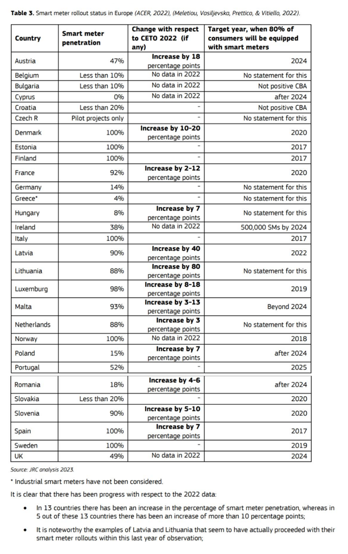 參與 JRC 調(diào)查的四分之三的 DSO 回答說,他們的智能電表覆蓋率低于 10%。另一方面,一個DSO報告的覆蓋率為40%。有關(guān)比利時的數(shù)據(jù)表明,一個DSO的智能電表覆蓋率不到5%。下表顯示了不同國家/地區(qū)2022年的智能電表部署狀態(tài),包括挪威和英國的信息。