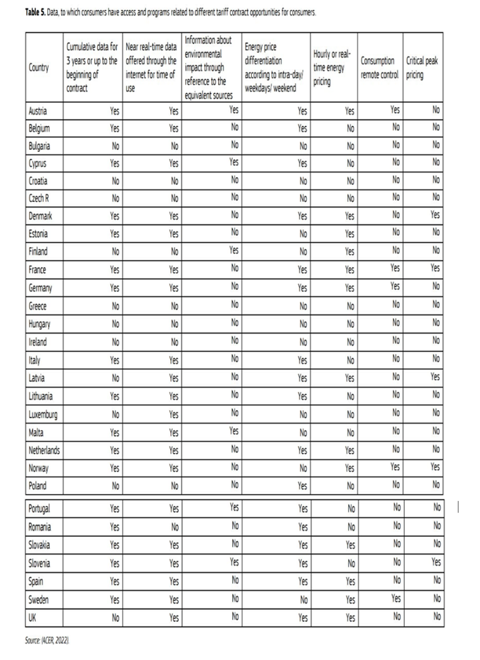- 根據(jù)靈活的電價提供的電力計劃。在這里,我們描述了消費者可以通過智能電表獲得的信息,以及有關(guān)通過智能電表提供的資費計劃的信息。表5顯示了消費者可以獲得的歷史消費量,以及有關(guān)不同國家/地區(qū)通過智能電表提供的靈活關(guān)稅產(chǎn)品的信息。這些計劃改善了消費者的賦權(quán),因為它們使客戶能夠調(diào)整電力消耗并利用動態(tài)電價。為了讓計劃生效,客戶需要對價格信號做出反應(yīng)。預(yù)計從 2023 年起將不再提供固定價格合同,而《電力內(nèi)部市場指令》規(guī)定,成員國必須確保配備智能電表的消費者能夠至少從一家供應(yīng)商(擁有超過 200,000 名客戶)獲得動態(tài)價格合同。應(yīng)向消費者明確此類合同的特征(ACER,2022 年)。